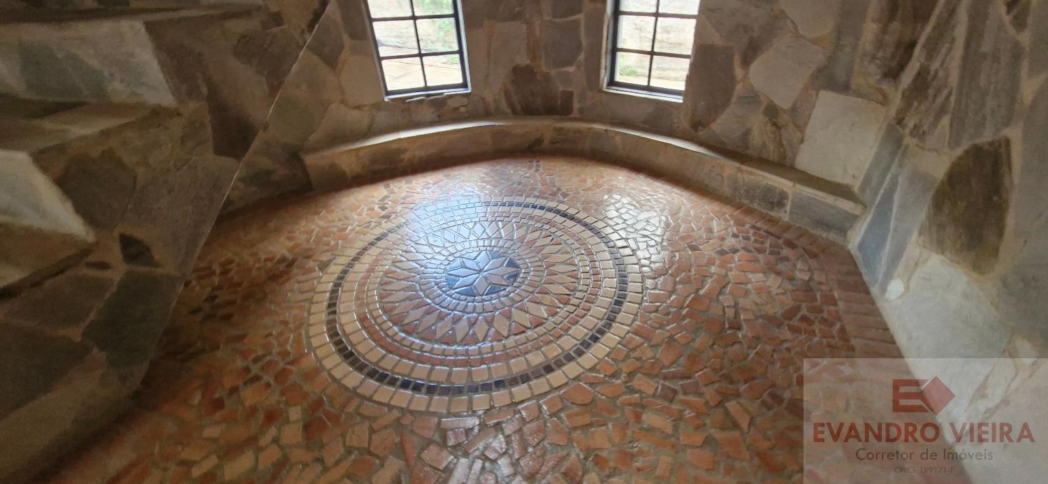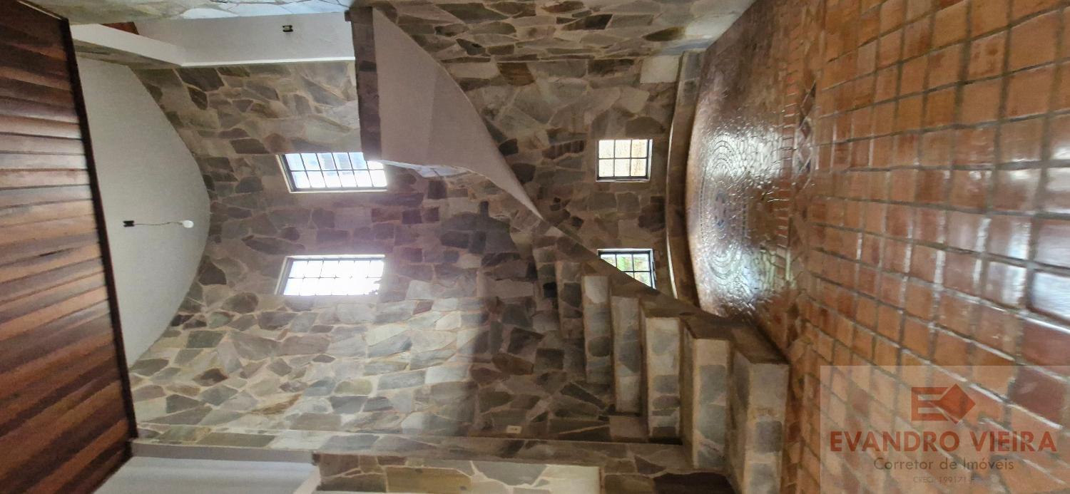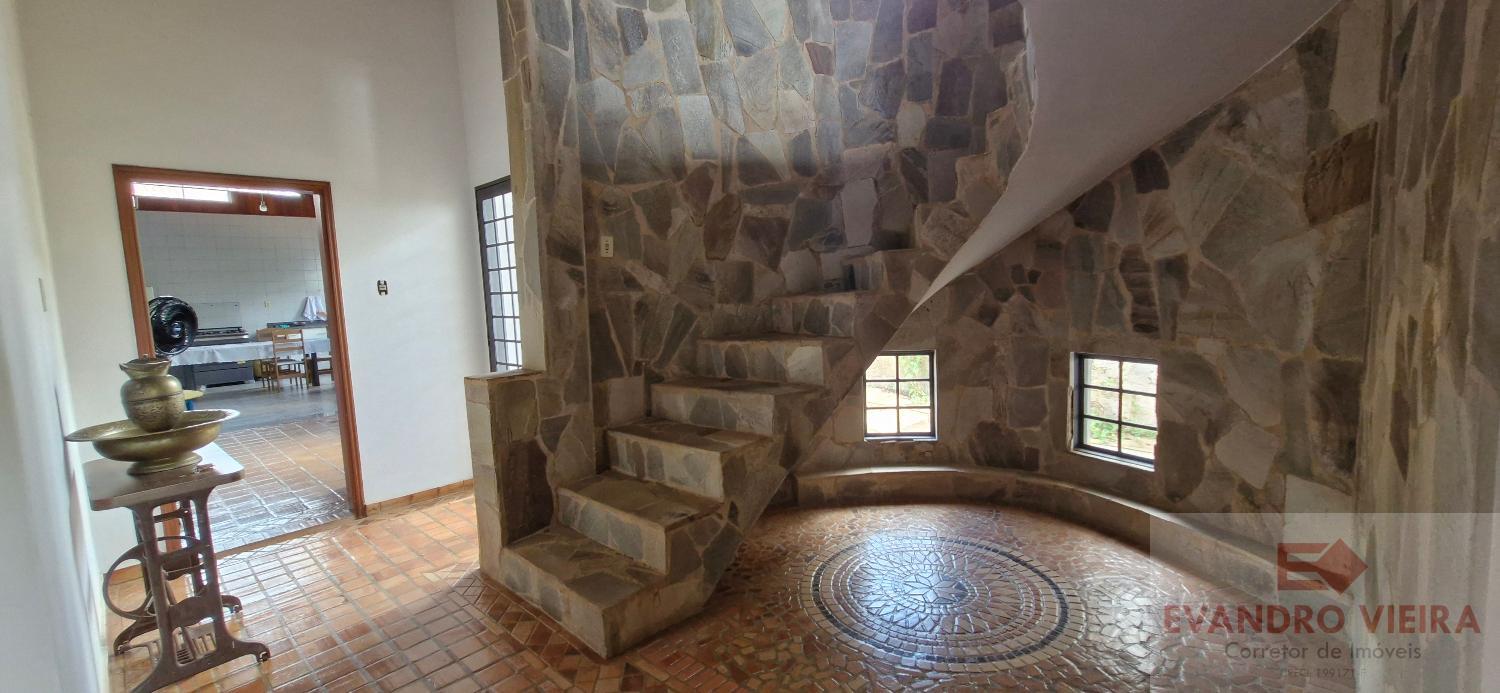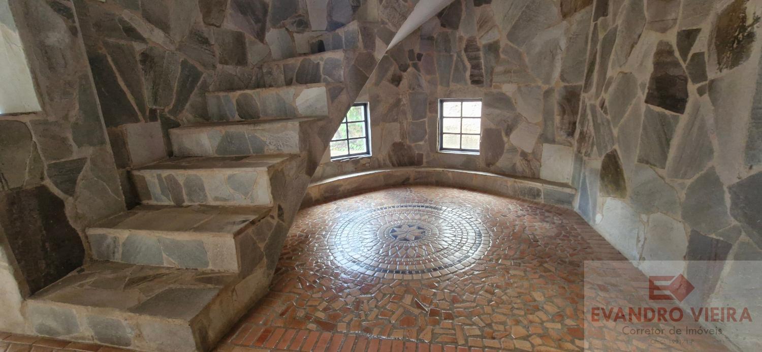 A sala de estar, mais reservada e muito espaçosa, conta com um belo Rosone bem posicionado, sob uma escada em caracol de alvenaria e revestida em pedra, dando acesso à parte superior da residência, deixando o ambiente ainda mais estiloso e acolhedor.